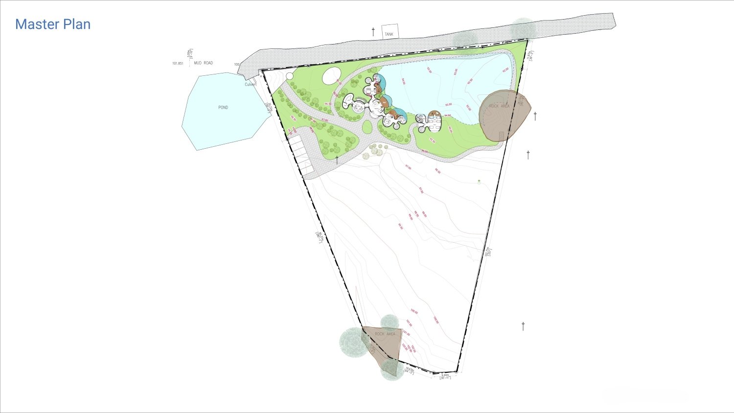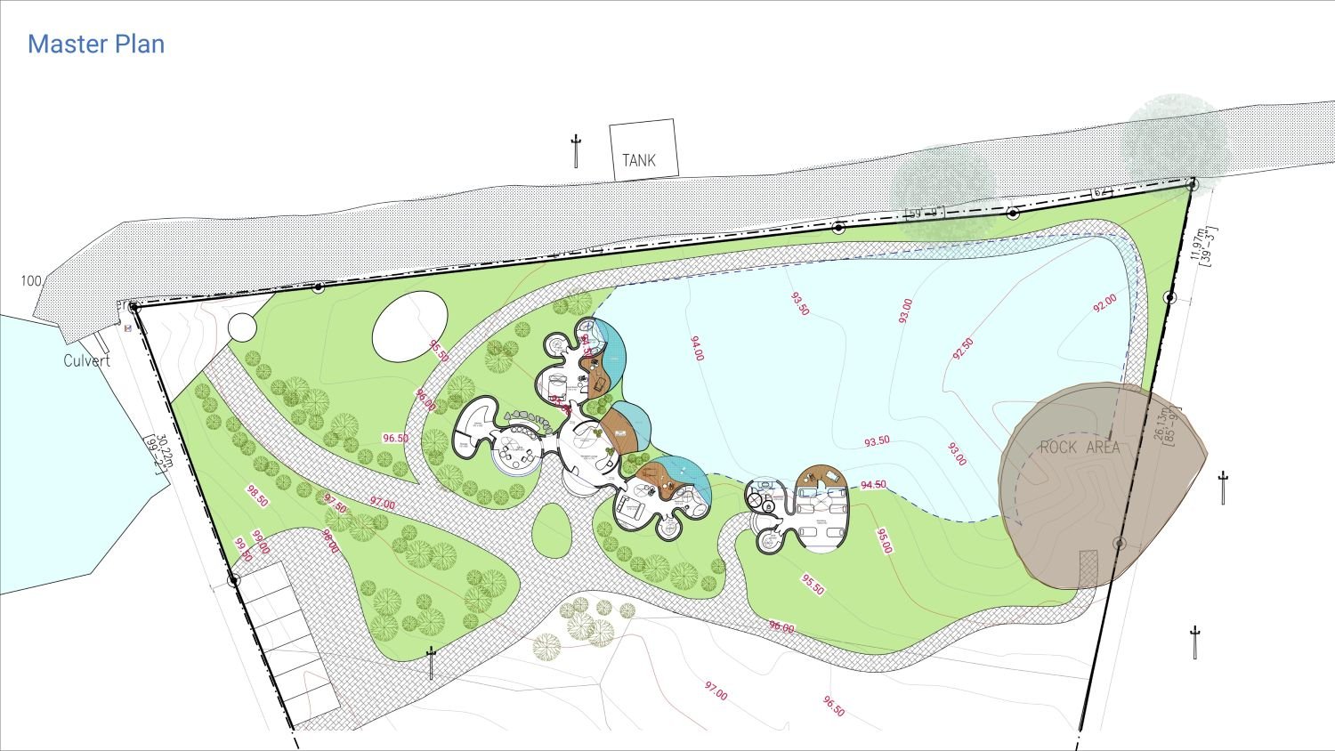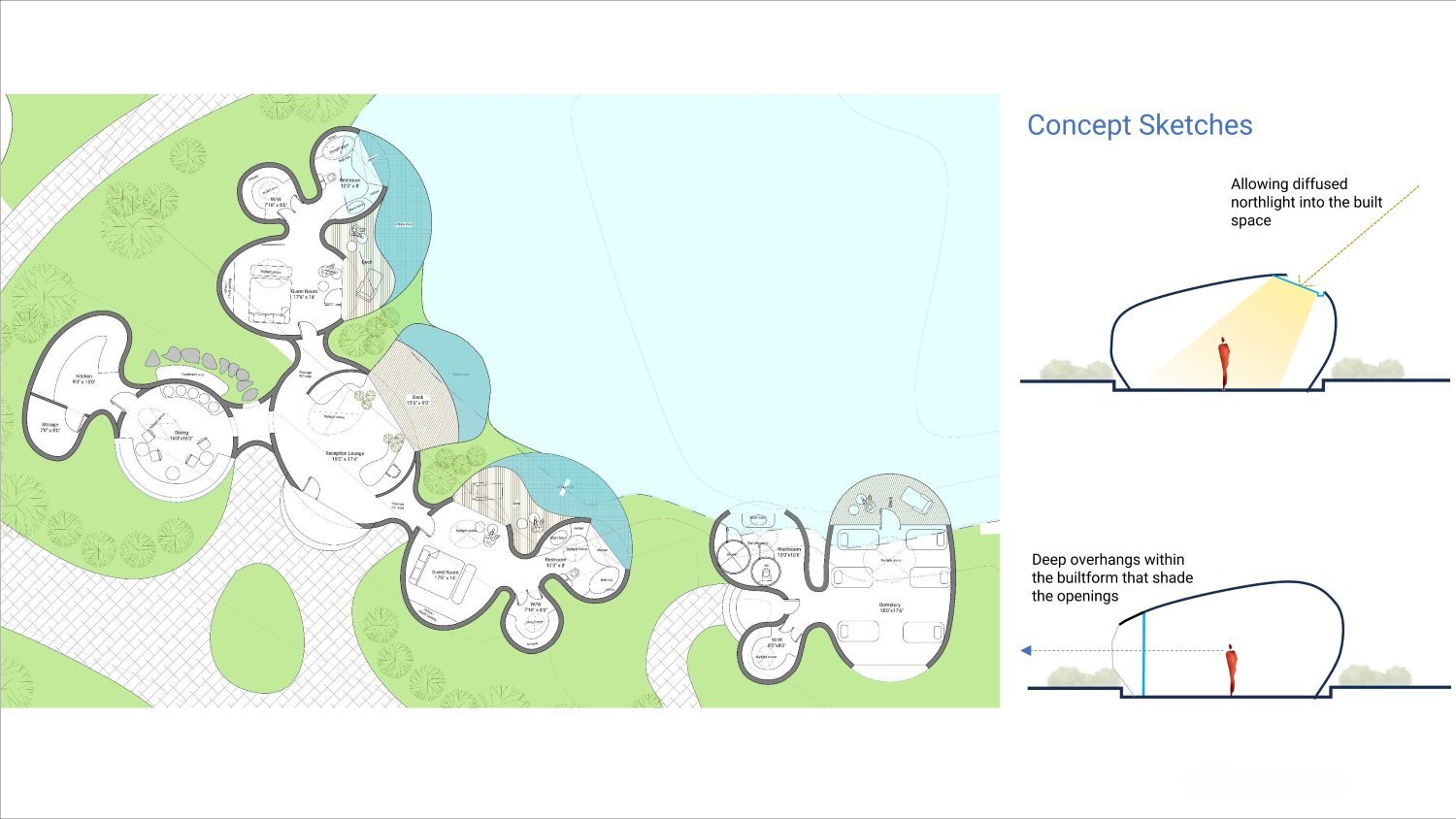 The spatial organization comprises a reception lobby that seamlessly merges with the living area, two guest bedroom wings, kitchen and dining spaces, and a separate dormitory block. All blocks are oriented towards an artificial lake, conceived as a site-level catchment feature, strengthening both visual connection and environmental performance. Deck areas and infinity pools define the semi-open transition zones, mediating between interior and exterior while enhancing the immersive relationship between architecture and landscape.
